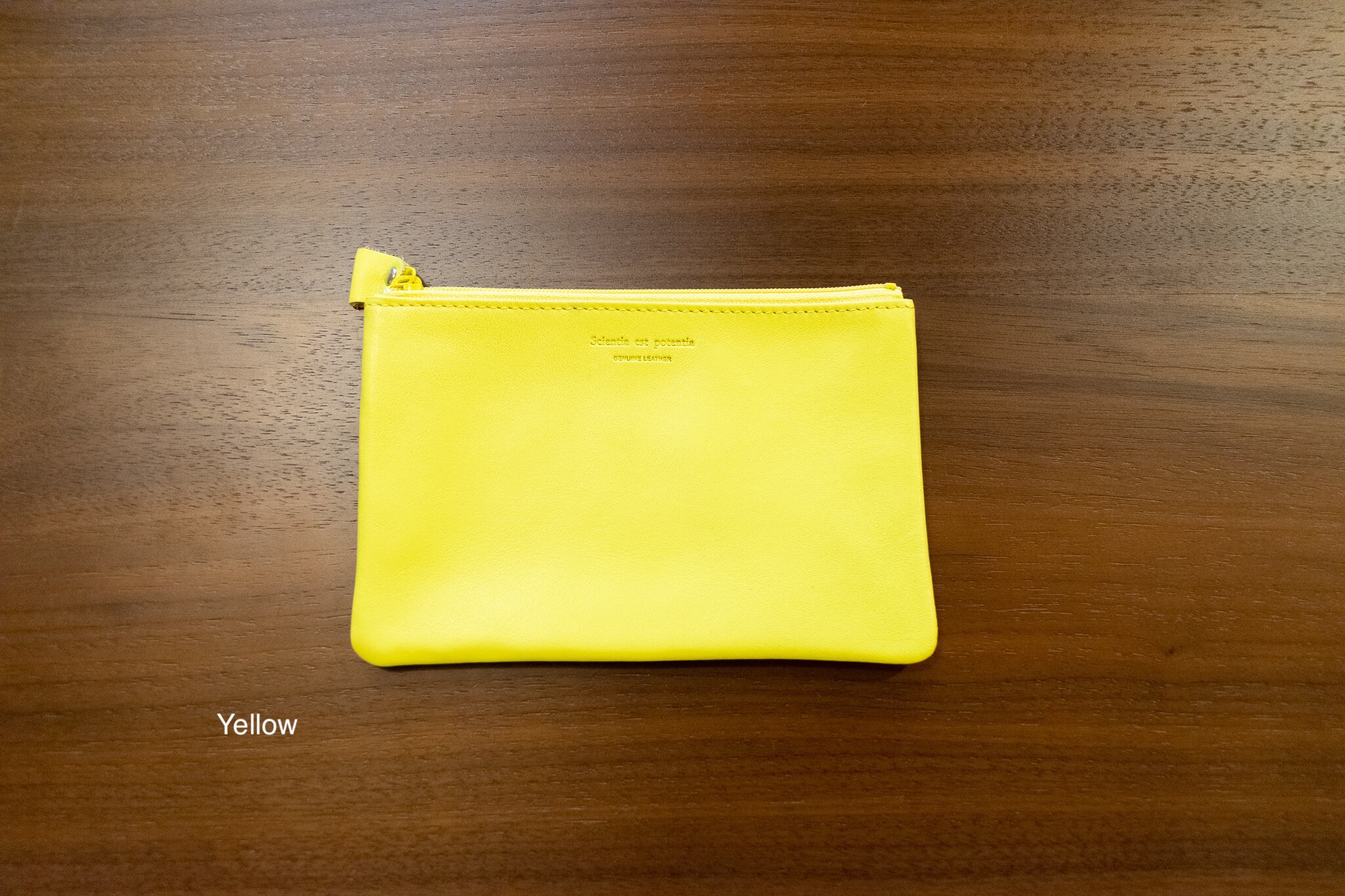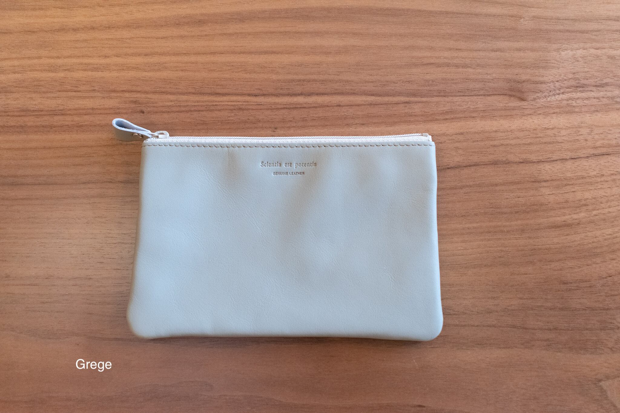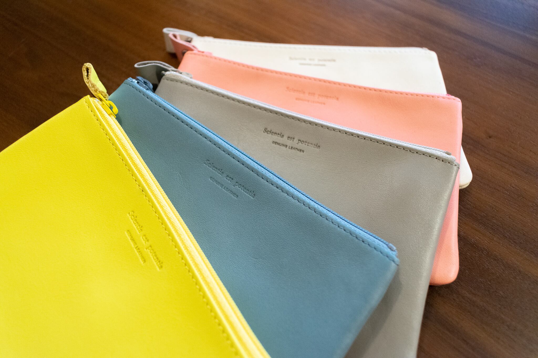 柔らかい質感と、カラフルで優しい色合いが特徴的な本革ポーチです。