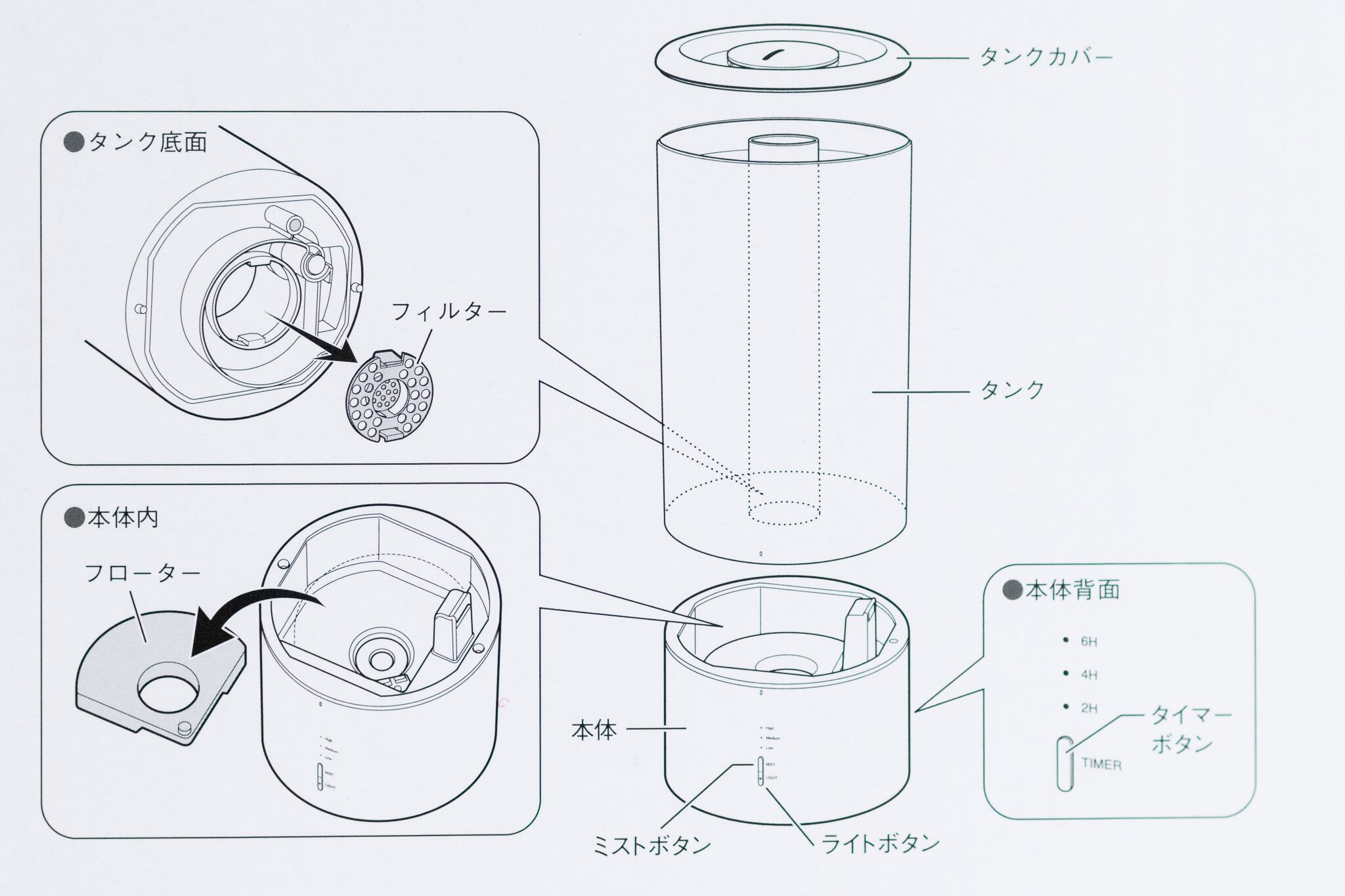 加湿性能/High 約250ml/h、Medium 約200ml/h、約100ml/h